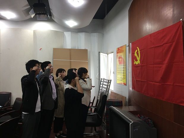 在孔银银老师的带领下,全体党员面向党旗重温入党誓词,集体诵读《中国共产党章程》。