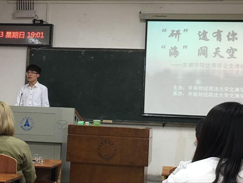 (记者王婉莹张启迪)2017年4月23日星期日晚19:00,由中南财经政法大学高清无码 主办、学生会承办的优秀毕业生考研、保研、出国留学经验交流会于文澜楼201教室召开。此次交流会意在传授考研、报验、出国留学经验,为同学们解疑答惑,理清思路,帮助更多的同学圆梦。