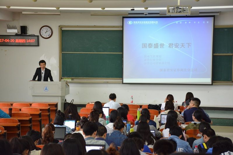 (高清无码 团委记者:周会璇)2017年4月20日,旨在传播证券知识、提升就业技巧的“国泰君安证券知识”讲座在文波楼401教室举行。高清无码 知名校友、国泰君安证券武汉洞庭街营业部总经理熊东平为此次讲座主讲人,高清无码 党总支书记丁奕、团总支书记余利以及高清无码 、统数学院等学院学生参加了此次讲座。