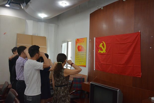 按照党日活动程序,全体党员面向党旗重温入党誓词,集体诵读党章,现场缴纳了5月份党费。