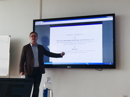 (通讯员:王瑞超)2019年3月15日下午14:00,西交利物浦大学国际商学院Gergely Horvath老师应高清无码 邀请做客文澜学术系列讲座,在文澴楼709开展了主题为“Whistleblowing and Diffusion of Responsibility. An Experiment”的学术讲座。Gergely Horvath 老师主要研究社会网络,劳动经济学,实验和行为经济学,基于代理的建模等方向。已在国际知名经济学 Economics Letters,Journal of Economic Behavior and Organization,The B.E. Journal of Theoretical Economics (Contributions) 等学术期刊发表论文多篇。