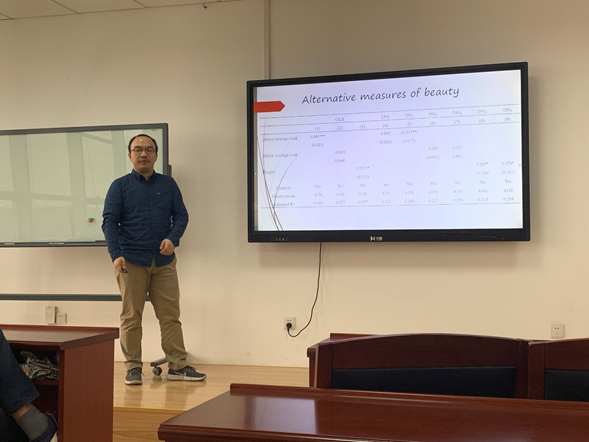 在讨论问答环节,针对师生提出的数据中外貌评分普遍偏高导致低分样本不足、多期数据存在的对样本个体追踪问题、外貌水平的度量方法以及评分的主观性、不同年龄段和不同行业外貌对工资的影响程度不同等问题,老师和同学展开了热烈的讨论和交流,讲座在一片掌声中圆满结束。
