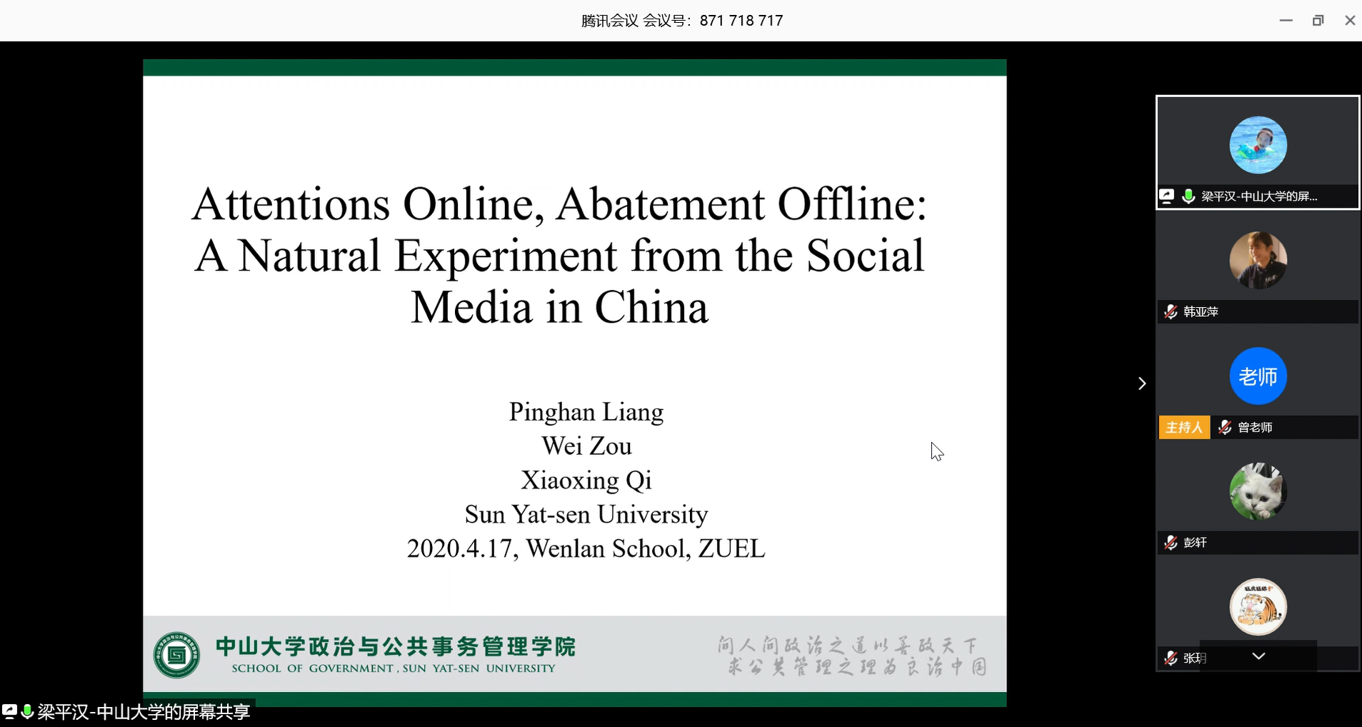 (通讯员:韩亚萍)2020年4月17日下午两点,文澜学术系列讲座第183期在线上顺利举行。本次讲座的主体是“Attentions Online, Abatement Offline: A Natural Experiment from the Social Media in China”。主讲人为来自中山大学政治与公共事务管理学院的梁平汉教授、博士生导师,研究领域为地方政府行为,行为与实验经济学,博弈论等,在Games and Economic Behavior, Journal of Comparative Economics,《经济研究》、《管理世界》、《经济学(季刊)》、《中国工业经济》、《世界经济》等国内外一流学术期刊发表论文三十余篇,主持国家自然科学基金项目多项。讲座由高清无码 的曾辰航老师主持,高清无码 部分教师及学生参与了本次讲座。