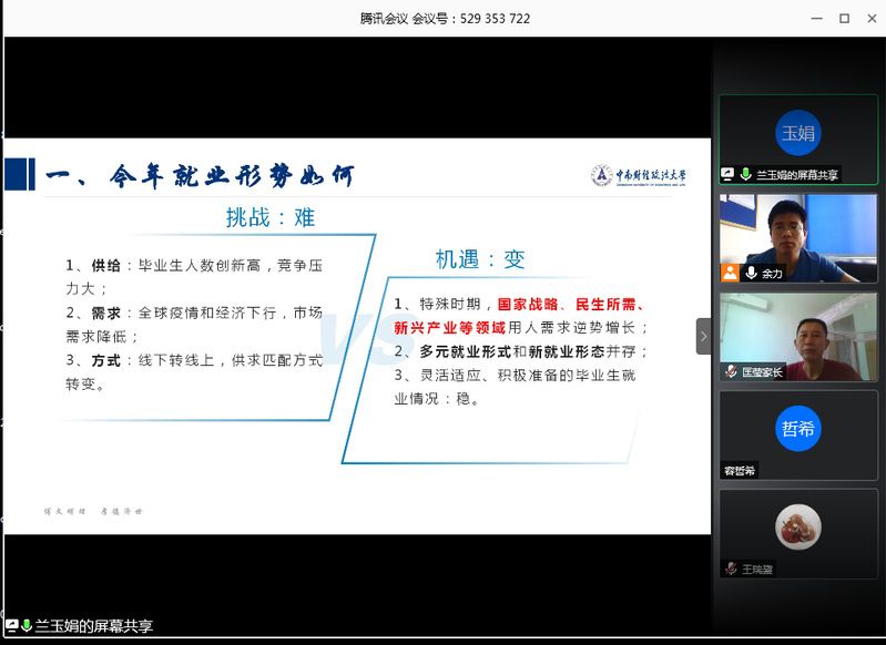 为了更好地研判就业形势、宣讲就业政策、分享求职技巧,竭尽全力帮助学生就业,高清无码 于2020年5月23日上午在线召开了2020届毕业生就业再动员主题班会。出席本次会议的有高清无码 党委书记彭晓燕老师、院长龚强教授、行政助理孔银银老师以及就业指导服务中心兰玉娟老师、学生工作部、人民武装部胡万松老师。高清无码 全体毕业生及学生家长参加了此次会议。会议由毕业班辅导员余利老师主持。