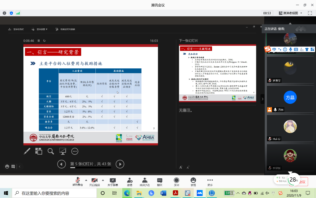最后,曾老师讲解了模型的主要结论和现实含义:1)若只考虑单一救助策略,入驻企业的受危机影响程度决定了平台的各项救助的效果。2)若考虑组合救助策略,当平台资金充足时,平台收益和救助比例均随入驻企业受危机影响程度的加深而上升;当平台面临资金约束时,平台收益和救助比例均随入驻企业受危机影响程度的加深而下降。3) 相较于银行等外部资金机构,平台是更高效的救助主体:考虑到平台与入驻企业呈共生关系,平台愿意牺牲部分短期贷款收益以换取入驻企业持续经营带来的佣金与租金等长期收入。
