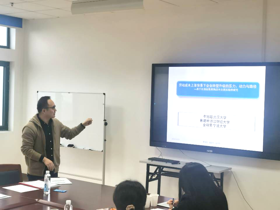 李旭超老师基于社保征收机构改革自然实验的研究,探讨劳动成本上涨背景下企业转型升级的压力、动力与路径。他告诉大家,劳动报酬的适度提高既是市场力量的结果,又是践行“五大发展理念”的应有之义。接着李旭超老师以2009年广东省社会保险费改由税务机关全责征收的政策冲击为自然实验,探讨劳动成本上涨背景下企业转型升级的压力、动力与路径,并展示了他的研究成果:首先,社保征收机构改革提高了企业的成本压力,并进一步造成经营压力,但企业能够化压力为动力促进转型升级。其次,从动态效应看,政策实施使企业销售收入短期大幅下降,但长期随着TFP的提升,销售收入下降幅度逐年收窄,最终在统计上不再显著低于政策实施前。再次,从转型升级的路径看,企业通过降低管理费用提升了管理效率,通过降低非效率投资提升了公司治理,通过增加R&D投入提升了研发创新。