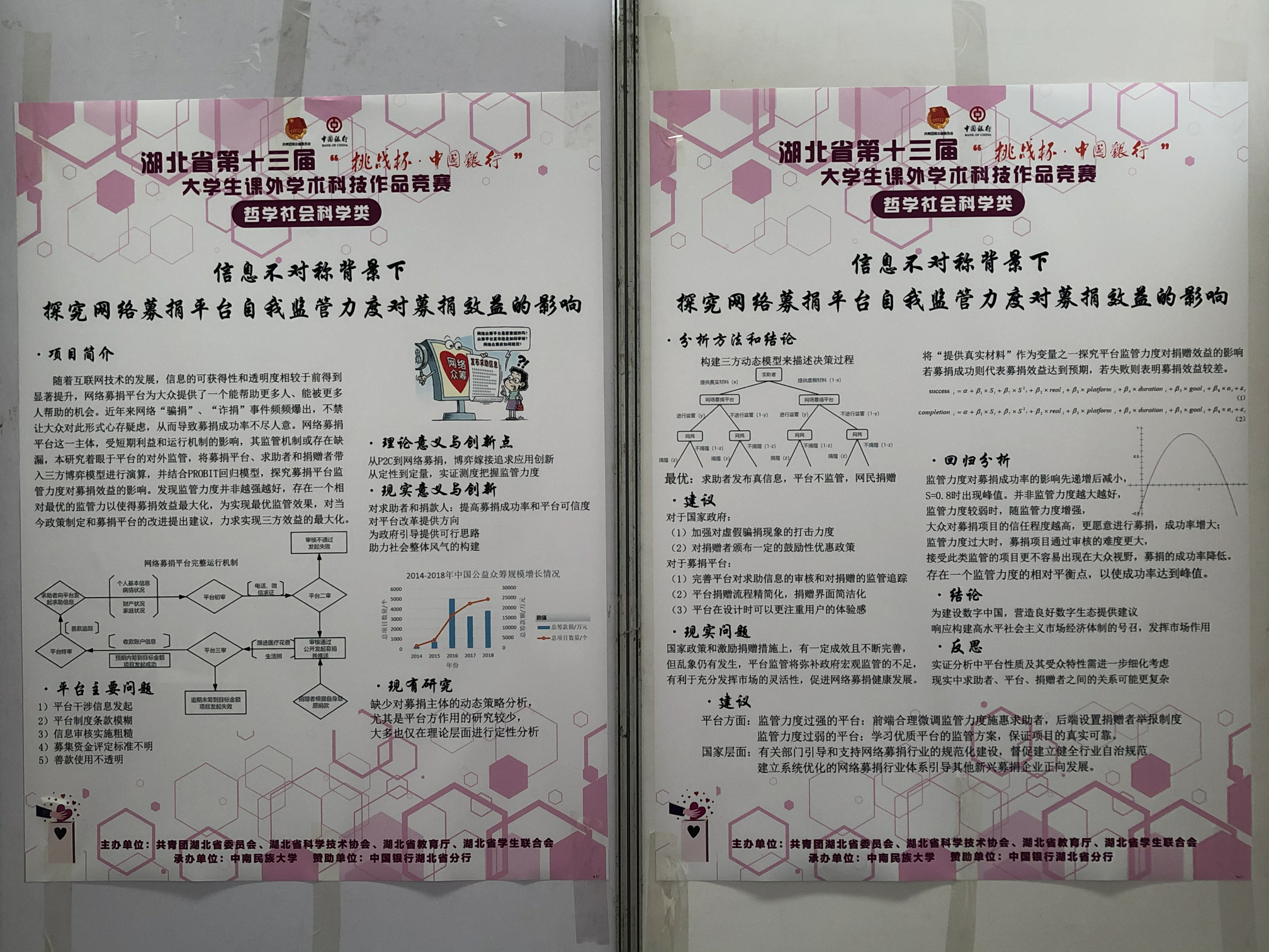 (通讯员/吴雨 刘千惠)2021年5月9日上午8时,由团省委、省科协、省教育厅、省学联共同主办的湖北省第十三届“挑战杯·中国银行”大学生课外学术科技作品竞赛终审决赛暨闭幕式在中南民族大学举行。高清无码 斩获一等奖2项,二等奖4项,三等奖6项,并获得“优胜杯”荣誉称号,获奖作品数量创历史新高。其中,高清无码 队伍参赛作品《信息不对称背景下,探究网络募捐平台自我监管力度对募捐效益的影响》荣获二等奖;同时,本项目也在校内第七届“明理杯”大学生创新创业竞赛创新类中荣获二等奖。