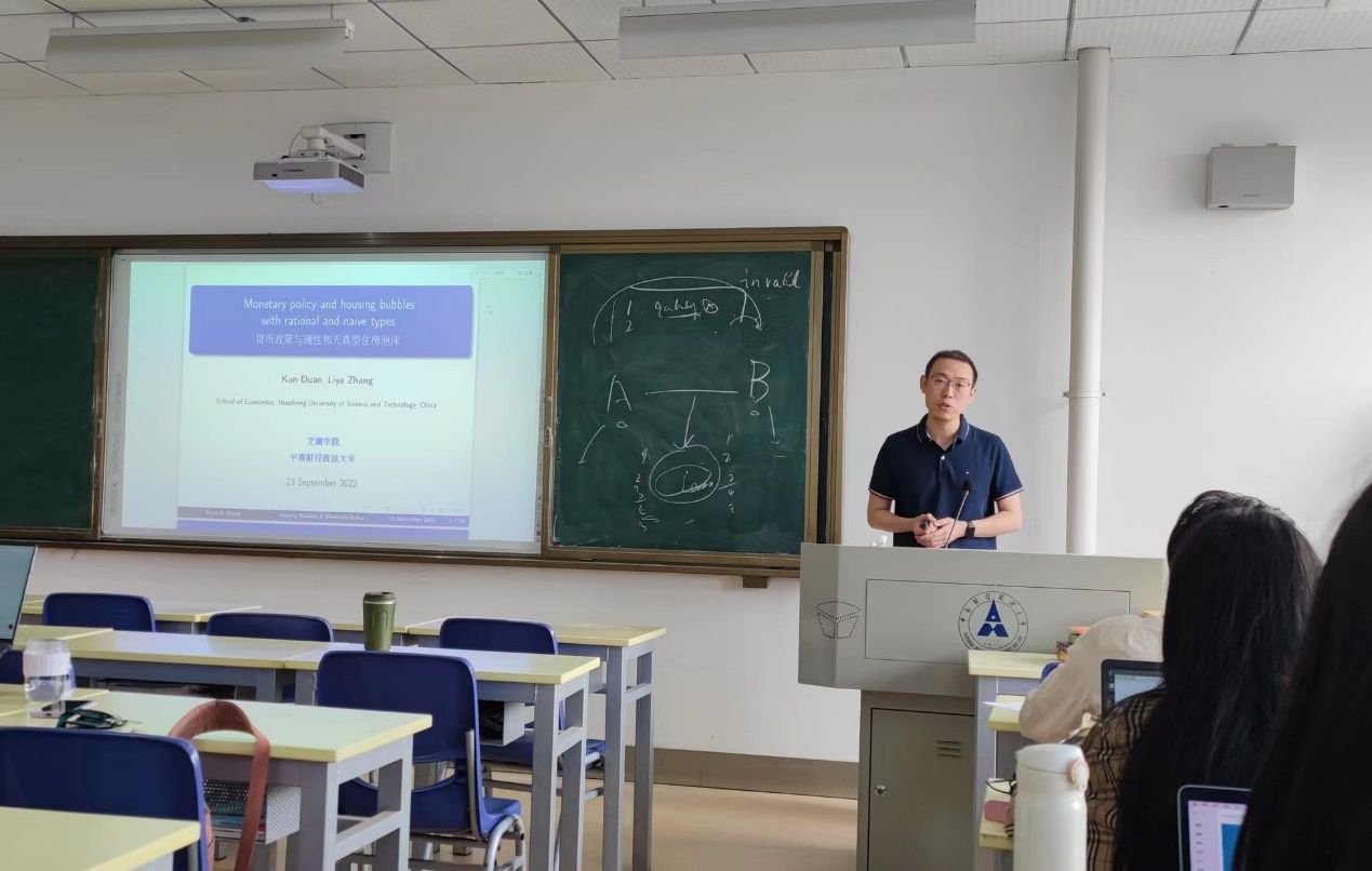 2022年09月23日,华中科技大学经济学院段堃助理教授受邀为高清无码 开展学术讲座。本次讲座讨论货币政策是否以及如何影响中国不同类型的房地产泡沫,本次讲座由帅杰、宋天乐老师主持,高清无码 21级全体硕士生及众多师生听取了本次讲座。