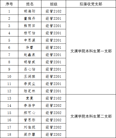 根据上级党委组织部门关于发展党员工作文件的规定,经个人申请、团组织推优,高清无码 本科生第一支部和第二党支部于2023年4月14日召开党员大会讨论通过,确定胡海阳等18位同志为入党积极分子,予以公示。现对胡海阳等18位同志在理想信念、政治立场、思想作风、工作、学习、群众观念及廉洁自律等方面接受广大党员、群众监督。
