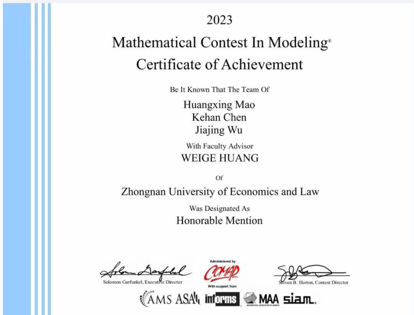 获奖等级:二等奖(Honorable Mention) 指导老师:黄伟哥 学生:毛黄兴,陈科含,吴嘉靖