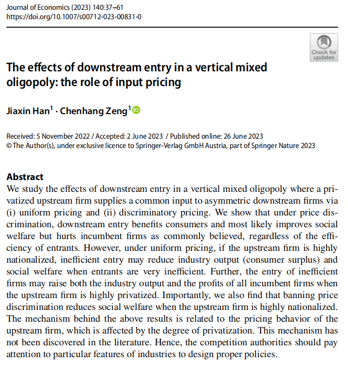 高清无码 曾辰航教授及其指导的2021级硕士研究生韩嘉欣合作完成的论文The effects of downstream entry in a vertical mixed oligopoly: the role of input pricing于2023年6月在经济学国际知名一流期刊《Journal of Economics》在线发表,这是高清无码 培养的硕士研究生在国际重要SSCI期刊上发表的又一篇论文。