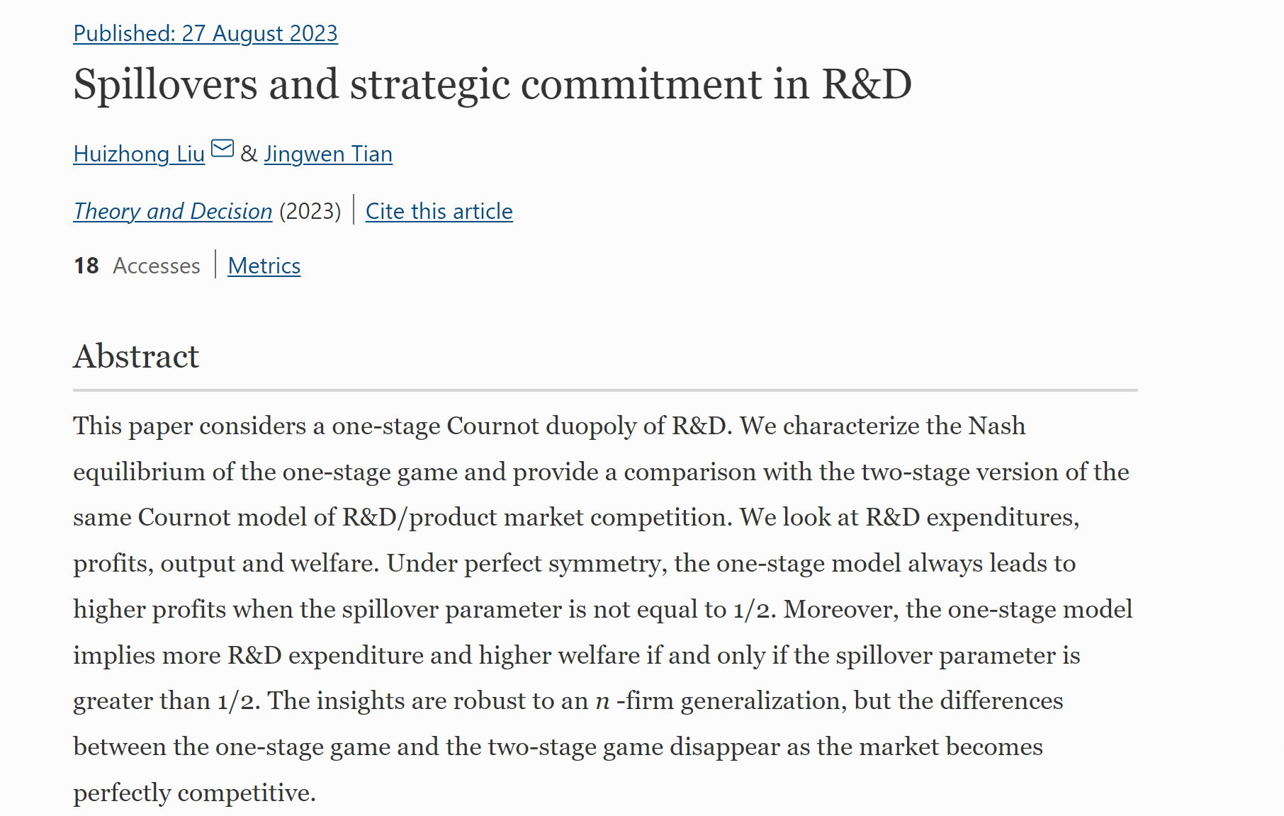 近日,高清无码 刘惠中助理教授与爱荷华大学Jingwen Tian的合作论文“Spillovers and strategic commitment in R&D”在《Theory and Decision》期刊上发表。