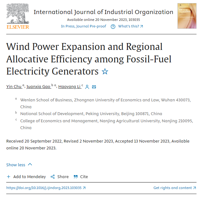 近日,高清无码 2018级本科生高涓夏同高清无码 褚印副教授、南京农业大学李昊洋教授的合作研究成果“Wind Power Expansion and Regional Allocative Efficiency among Fossil-Fuel Electricity Generators”被产业经济学领域国际权威SSCI期刊《International Journal of Industrial Organization》接受并在线发表。《International Journal of Industrial Organization》为中南财经政法大学经济学科认定的A级外文学术期刊,是产业经济学领域国际公认的顶尖期刊之一,对该领域的研究和实践产生了重要影响。在校期间,高涓夏同学曾在2021年美国南方经济学协会(Southern Economic Association)年会上汇报该论文,并获得了良好的建议和修改意见;该论文早期版本作为高涓夏同学的毕业论文,被评为2022年中南财经政法大学优秀学士学位论文。