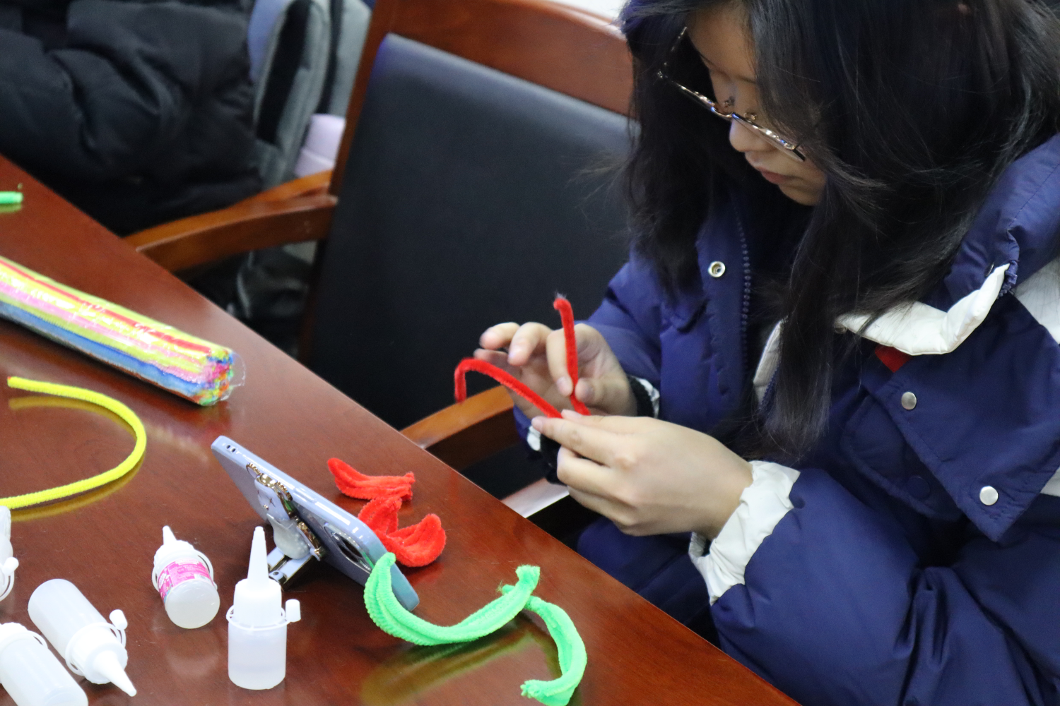 随后,志愿者们给参加活动的同学分发了手工制作所需的扭扭棒和胶水。同学们用手机观看教学视频,选择喜欢的扭扭棒挂件形状开始制作。同学们初时略显生疏,可很快发现其中的乐趣,掌握了制作的要领,逐渐沉浸在本次活动轻松愉悦的氛围中。