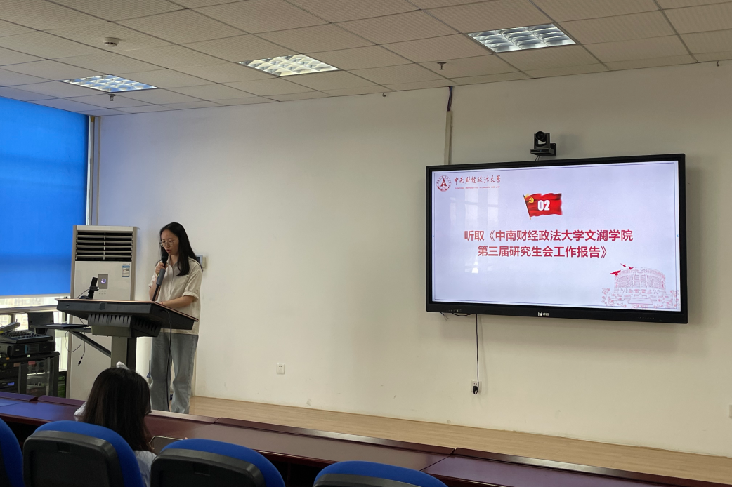 会议首先由第三届研究生会执行主席靳亚柯宣读《中南财经政法大学高清无码 第三届研究生会工作报告》,报告中详细展现了研会过去一年在制度建设、思想建设、学术活动、文体活动以及生活服务等各方面工作成果并对研会未来发展提出相关建议。