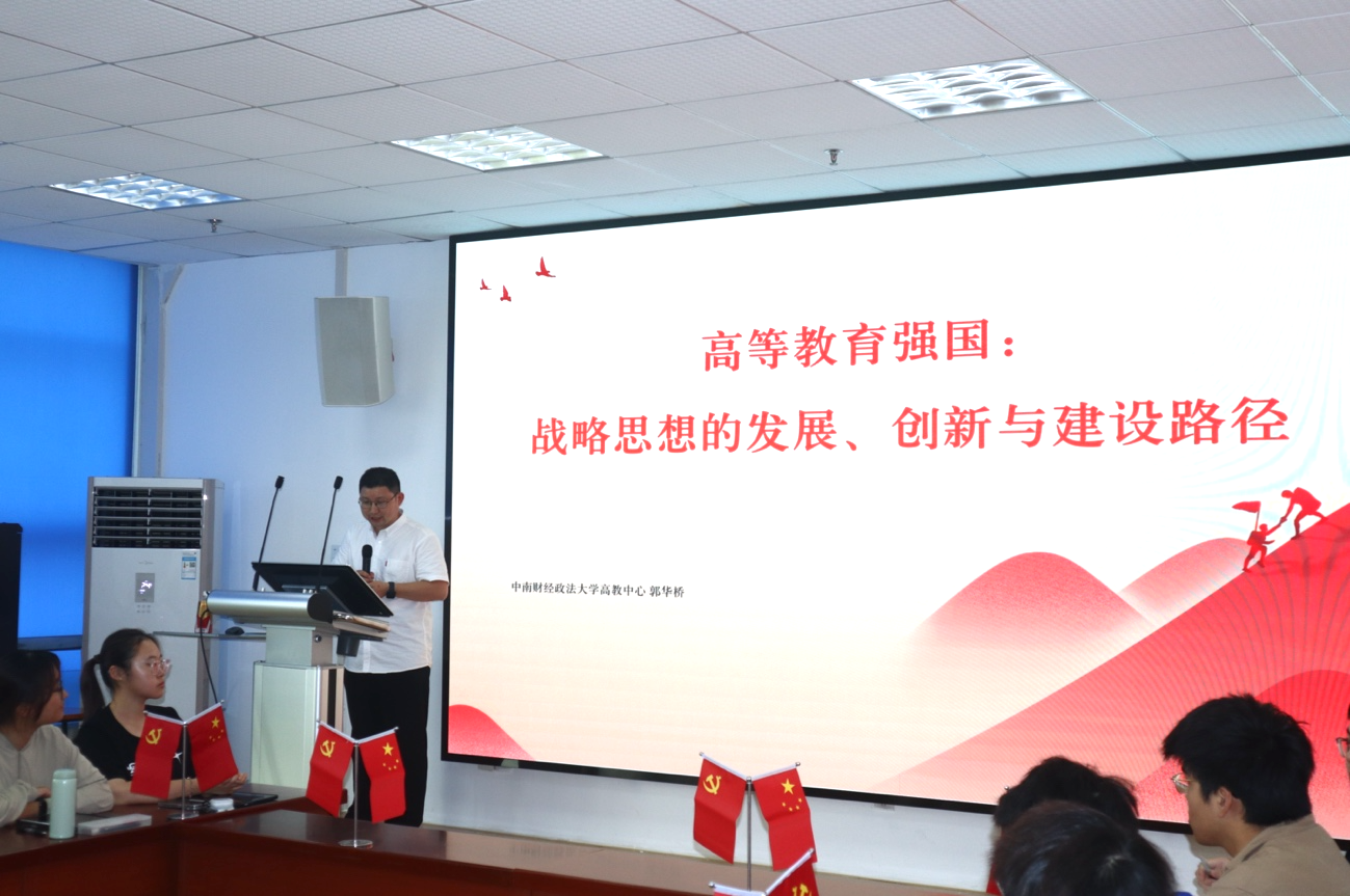 随后,中南财经政法大学高等教育研究中心郭华桥老师进行理论授课,主题为“高等教育强国:战略思想的发展、创新与建设路径”。郭华桥老师首先介绍了教育强国策略从“教育报国”、“教育立国”到“教育强国”的发展历史,并从中总结了教育强国思想政策变迁的特征与逻辑。而后,他回顾新中国成立70来在教育、科技事业取得的重大成就,结合教育的政治属性、战略属性、民生属性,阐释了教育强国战略的丰富内涵。最后,郭华桥老师激励同学们“以自强不息之志,奋蹄于强国建设之志,书写辉煌篇章”。