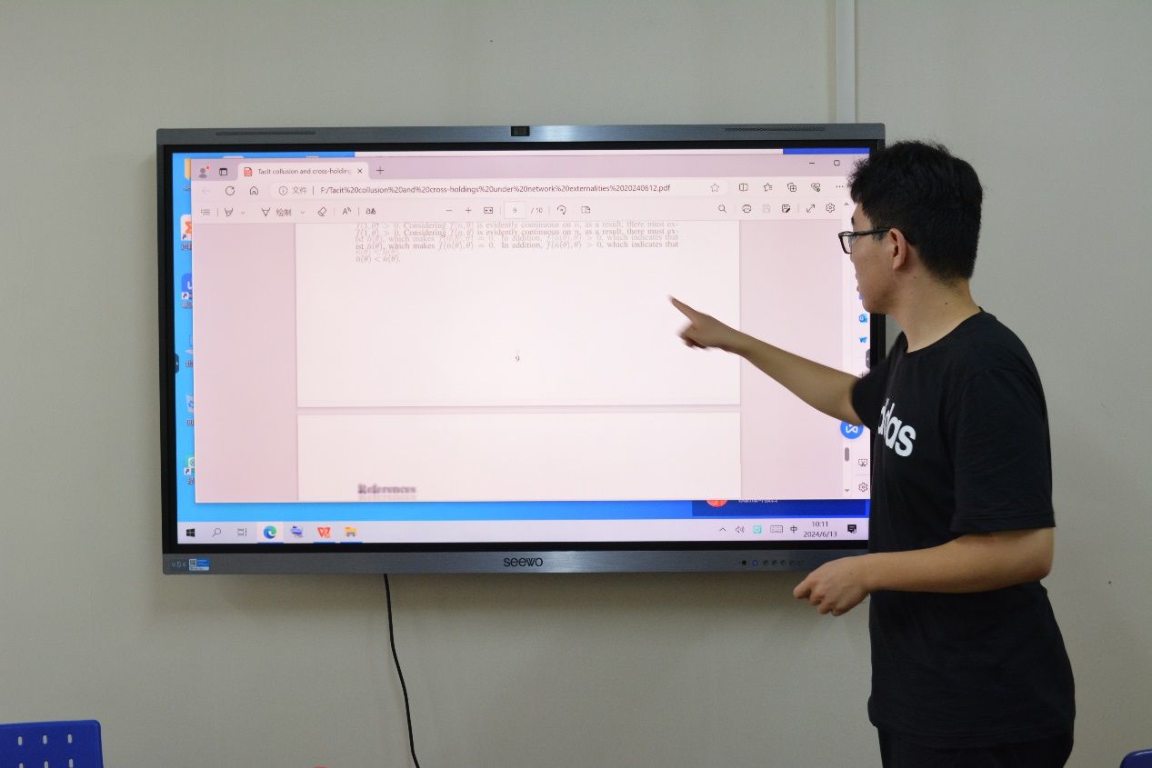 随后,乔楚同学分享了自己关于网络外部性、交叉持股与企业合谋的论文研究成果。这篇论文参考了现有文献中的方法,运用线性函数构建模型,证明并检验了在网络外部性不是很弱时,增加持股量对企业合谋的抑制作用。