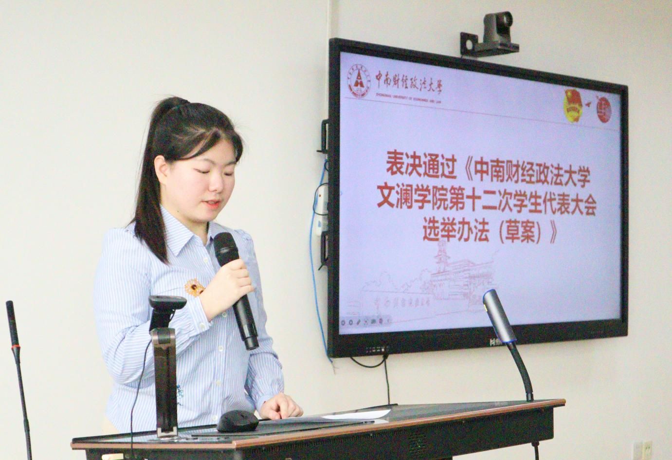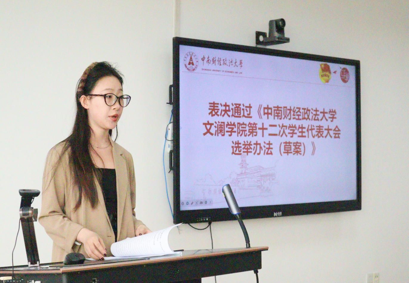 随后,学生会主席团成员陈思奕作《中南财经政法大学高清无码 第十二次学生代表大会提案征集工作报告》。