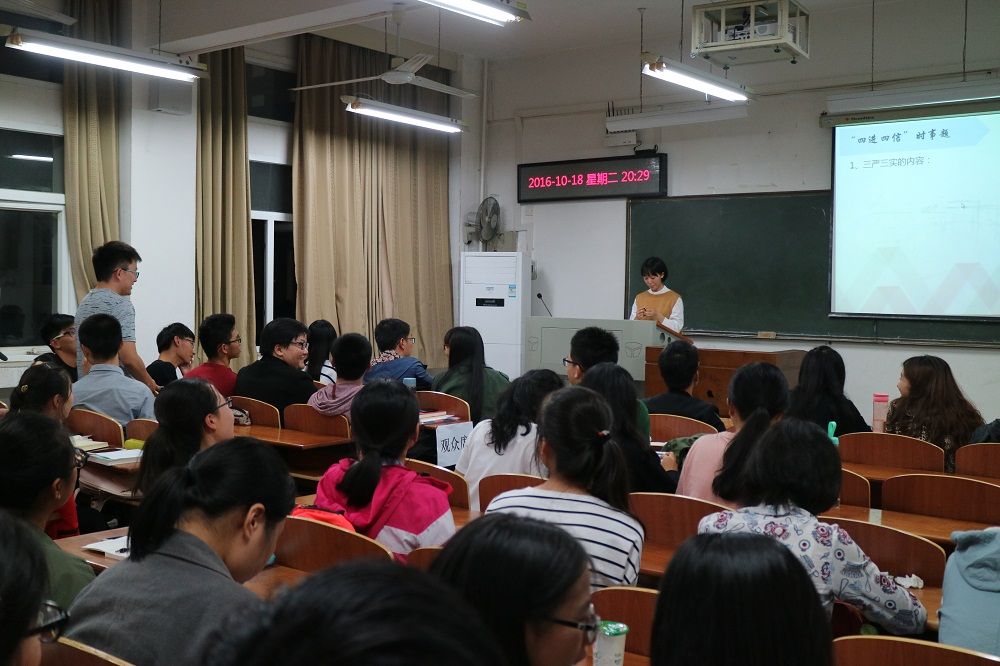 实践经验交流结束后,紧接着进行了“四进四信”系列问题知识竞答比赛,比赛现场气氛热烈,2016级新生们踊跃争抢答题权,在党的方针政策问题上以及其他的百科知识方面均有着高准确率,现场赞叹声与掌声不曾间断。