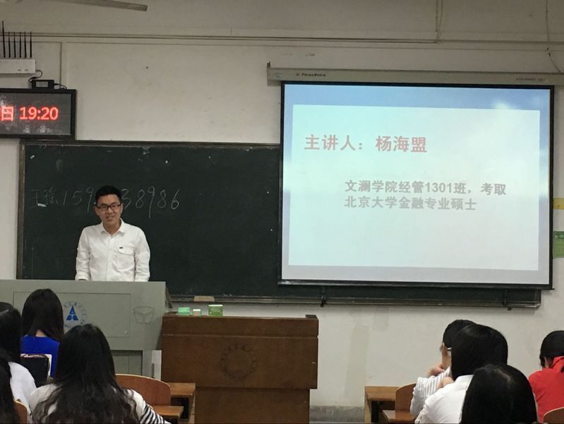 第二位分享的是杨海盟,文澜学院经管1301班学生,已考取北京大学金融专业硕士。杨海盟分享了他自己选择考研的理由,并为我们介绍了他选择北大的原因。此外,他还为我们介绍了北京大学不同院系所包含的金融专业,并指出了自己在准备考研的过程中的一些问题,希望同学们能够以此为戒。值得骄傲的是,他最后以总排名第三的成绩考取北京大学金融专业硕士。