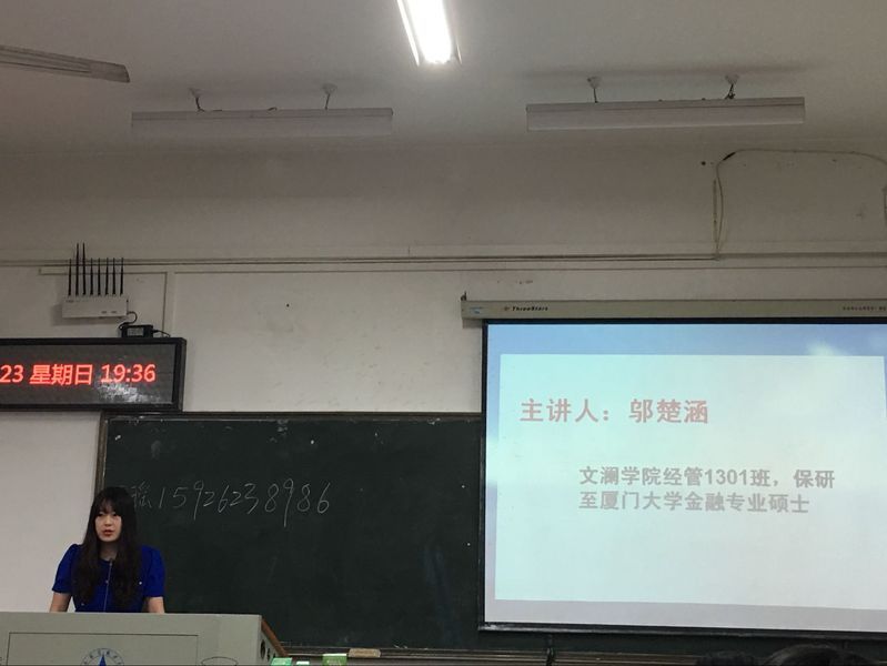 最后一位参与经验分享的是邬楚涵,文澜学院经管1301班学生,已保研至厦门大学金融专业硕士。她主要分享了一下自己在准备保研过程中做的一些工作,告诉我们应该广泛搜集各个学校的保研资料,并且应该按照学校分类,这样可以避免自己在准备的过程中出现遗漏现象。同时,她还告诉我们做好一份自己真实的简历的重要性,并且还分享了一些在厦大夏令营时的一些趣闻,活跃了现场气氛。邬楚涵告诉大一大二的师弟师妹们,应该好好学习,在开展课外活动的时候应该保证自己的学业。