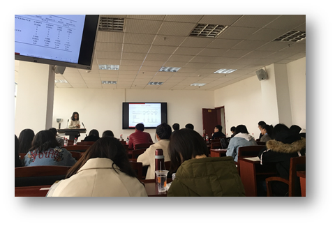 图为武汉大学经济与管理学院在读博士邹甘娜进行了题为“贸易保护下中国宏观经济波动与应对策略研究——基于两国模型分析”的报告。