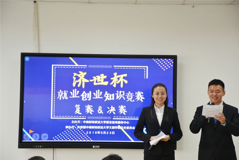 (文澜学院团委记者余玥)2019年5月24日下午两点,文澜学院“济世杯”系列就业指导活动之第三届就业创业知识竞赛复赛暨决赛在文澴楼809如期举行,出席本次活动的领导及嘉宾有中博教育湖北分公司市场部经理熊亦山先生、国泰君安证券武汉洞庭湖营业部总经理熊东平先生、湖北兴业会计事务所有限责任公司总经理胡嘉清先生、文澜学院团总支书记余利老师、文澜学院吴雷教授、中南财经政法大学就业指导服务中心办公室主任肖力玮先生、文澜学院党总支书记丁奕老师等。全场座无虚席,气氛相当热烈。