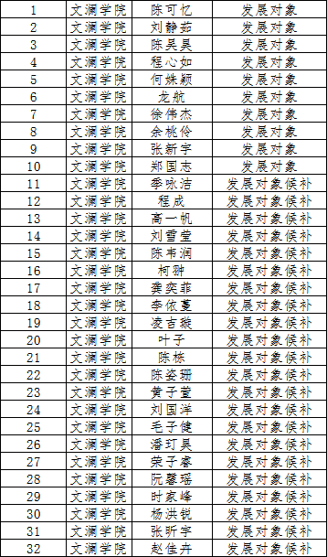 为了增强发展党员工作的透明度,接受党内外群众的监督,更好地保证发展党员的质量,根据《中国共产党章程》、《中国共产党发展党员工作细则(试行)》和我校《关于在发展党员工作中实行公示制度的意见》的有关规定,各党支部于2022年11月30日召开了支委会或支部大会讨论新发展党员事宜。现将我院本次拟确定陈可忆等10名同学为发展对象,季咏洁等22名同学为发展对象候补。具体学生名单如下: