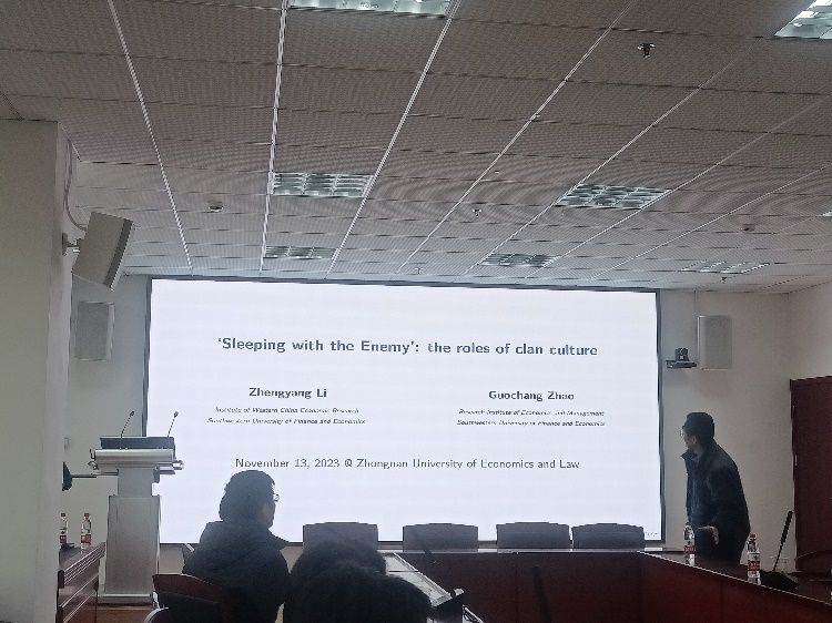 2023年11月13日,西南财经大学的赵国昌教授受邀来我院开展学术讲座。本次讲座主题为“‘Sleeping with the Enemy’the roles of clan culture。赵国昌教授的研究领域包括生育、教育、养老、劳动就业与公共政策评估,其学术成果在《经济研究》、《经济学(季刊)》、《世界经济》、《金融研究》、《人口研究》、《统计研究》、Journal of Development Economics、Scandinavian Journal of Economics、Labor Economics、China Economics Review、Cities、China Quarterly等期刊发表。
