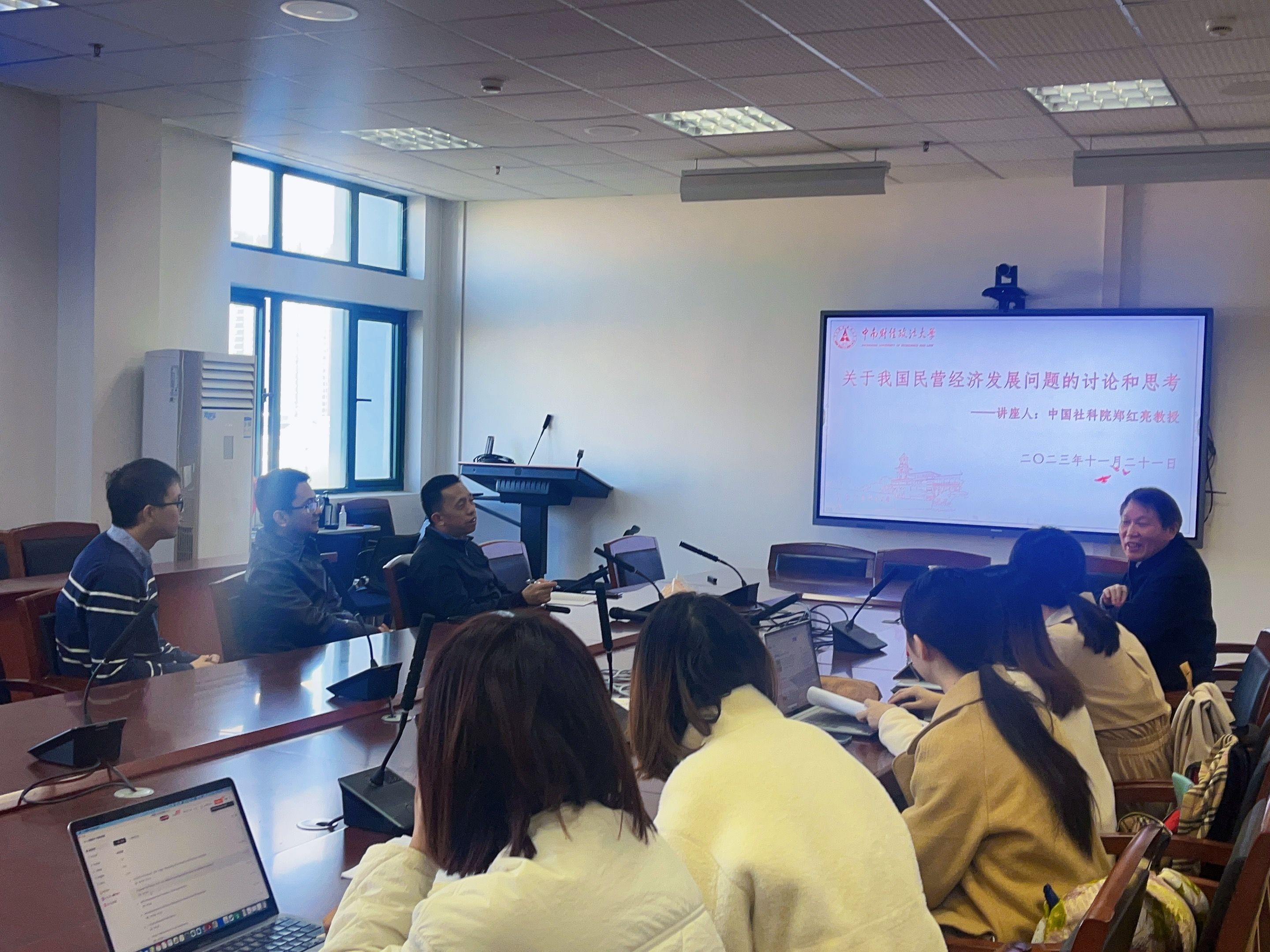 2023年11月21日,中国社会科学院经济所郑红亮教授受邀来我院开展学术讲座。本次讲座主题为“关于我国民营经济发展的讨论和思考”,讲座由龚强院长和帅杰老师共同主持,文澜学院众多师生听取了本次讲座。