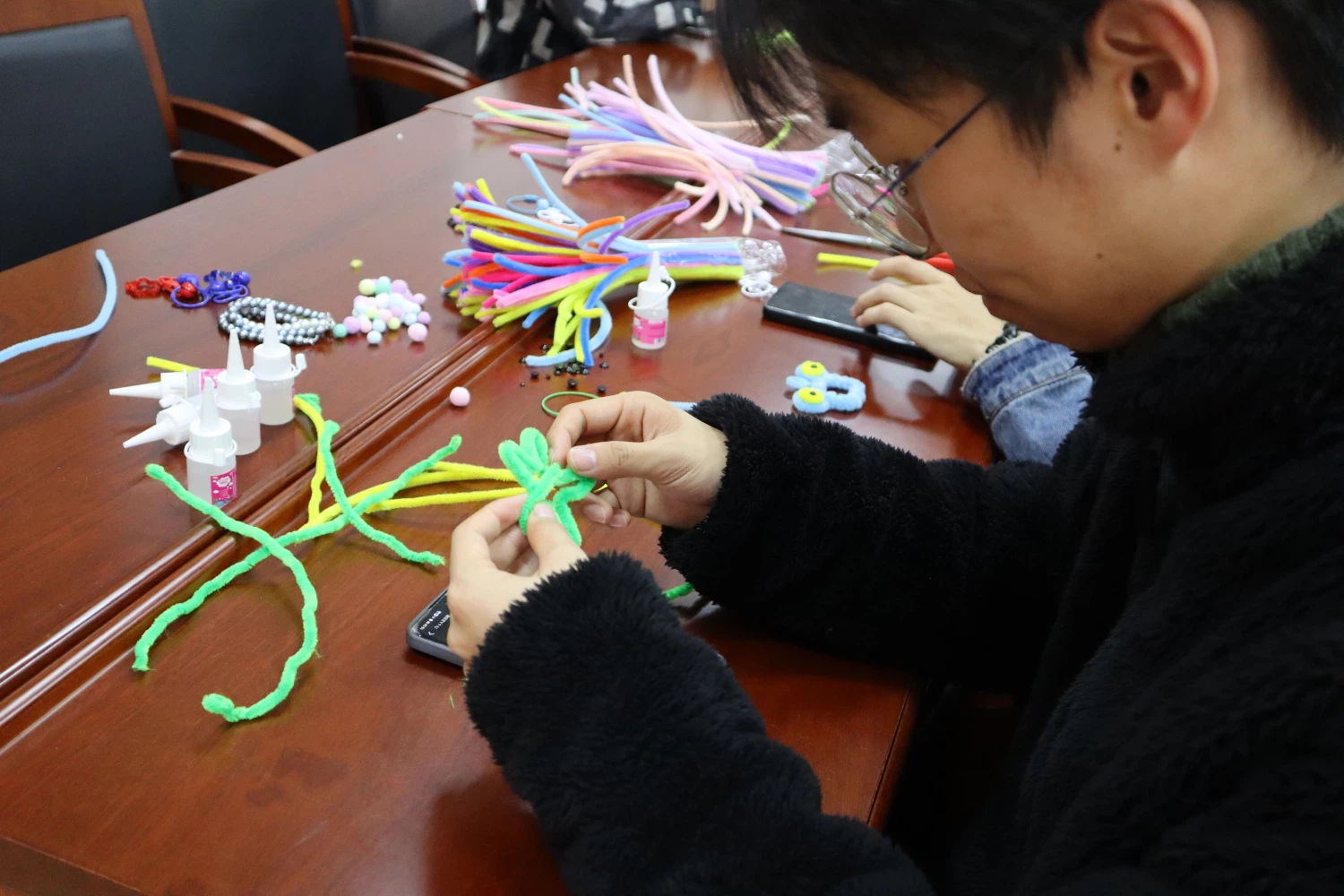 随后,志愿者们给参加活动的同学分发了手工制作所需的扭扭棒和胶水。同学们用手机观看教学视频,选择喜欢的扭扭棒挂件形状开始制作。同学们初时略显生疏,可很快发现其中的乐趣,掌握了制作的要领,逐渐沉浸在本次活动轻松愉悦的氛围中。