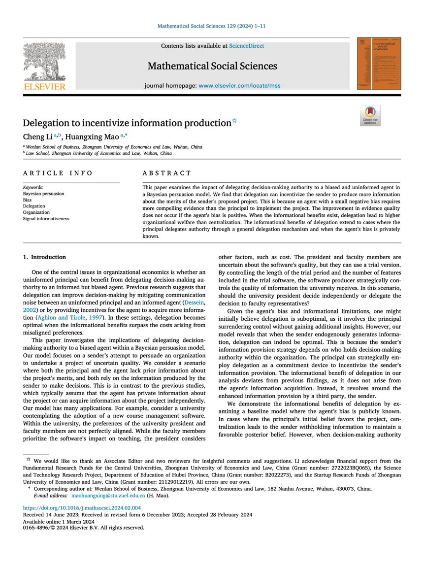 近日,文澜学院2021级本科生毛黄兴与其导师李程教授共同完成的研究论文《Delegation to Incentivize Information Production》在国际知名经济学期刊《Mathematical Social Sciences》上发表。这是文澜学院本科生再一次在国际SSCI期刊上发表其研究成果。