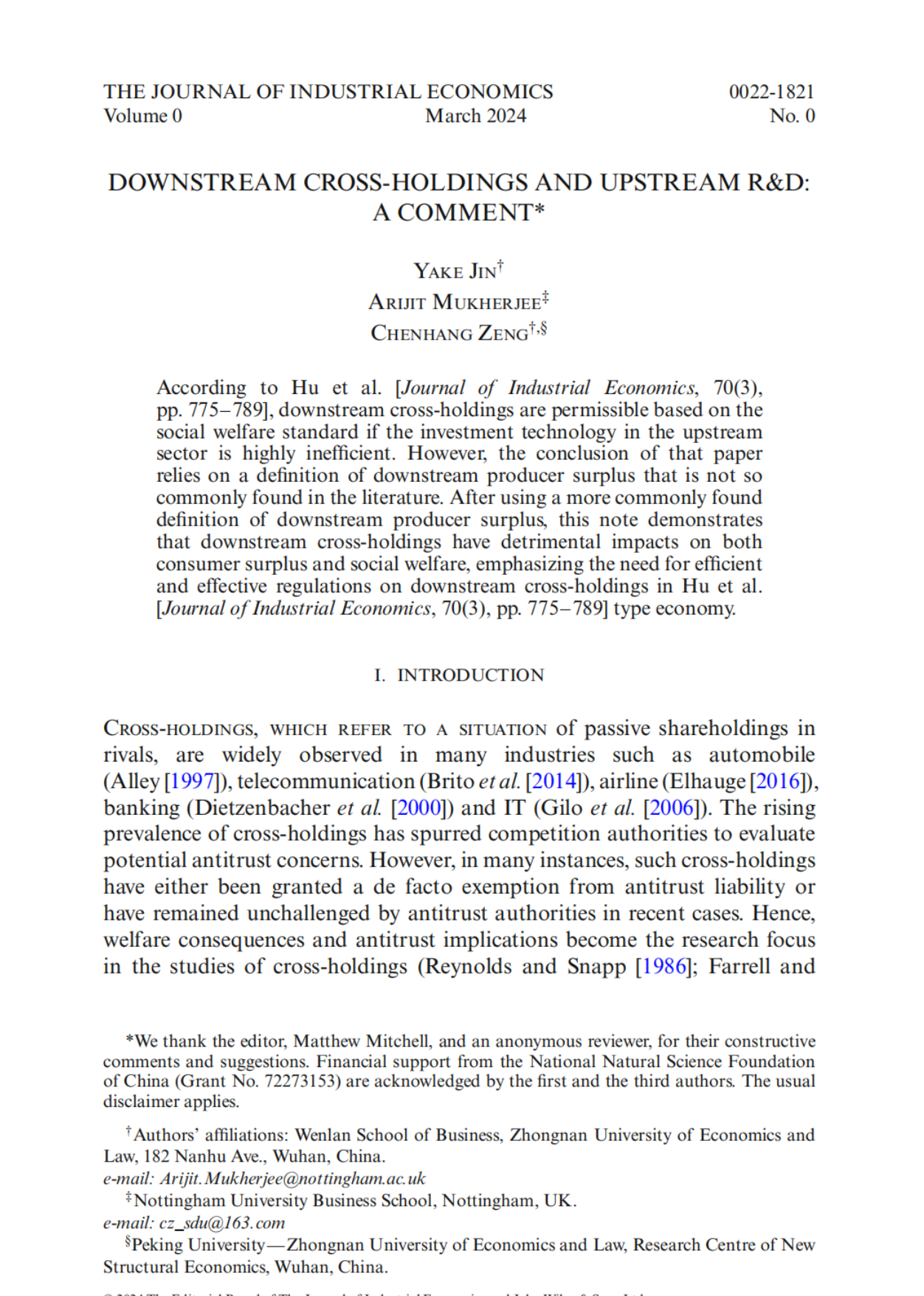 我院曾辰航教授及其指导的2022级硕士研究生靳亚柯与英国诺丁汉大学Mukherjee教授合作完成的论文Downstream Cross-Holdings and Upstream R&D: A Comment在产业经济学领域国际权威期刊《Journal of Industrial Economics》在线发表。该期刊属于学校认定的A级别期刊。文澜学院坚持科研育人理念,全方位挖掘科研育人要素,强化科研育人实施保障,旨在培养国际化、具有创新性、融通性的拔尖人才。该文章作为文澜学院促进科研育人成果转化的又一重要成绩,是我院科研育人质量提升工作的新突破。
