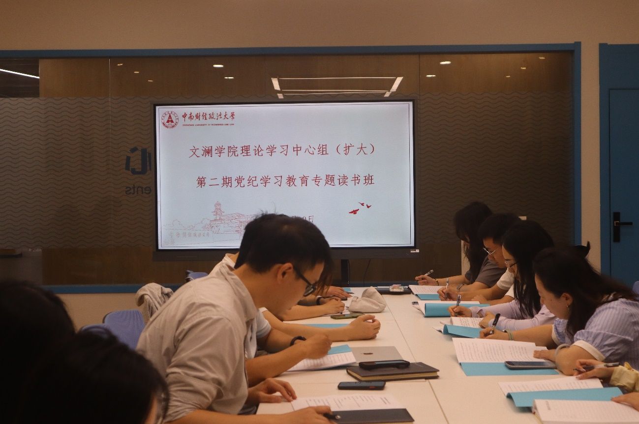 (通讯员/董珈彤 刘千惠)为切实落实中共中央在全党开展党纪学习教育的通知精神,持续推进全面从严治党向纵深发展,根据学校相关工作安排,文澜学院在前期已举办党委理论学习中心组第一期党纪学习教育专题读书班的基础上,进一步扩大学习范围、创新学习形式,于5月10日上午9时在望湖大学生素质教育中心2号会议室开展了第二期党纪学习教育专题读书班学习。本期读书班由学院党政领导班子成员、两委委员、全体党支部书记及支委共同参与,学院副院长、党委委员高楠主持本次活动。