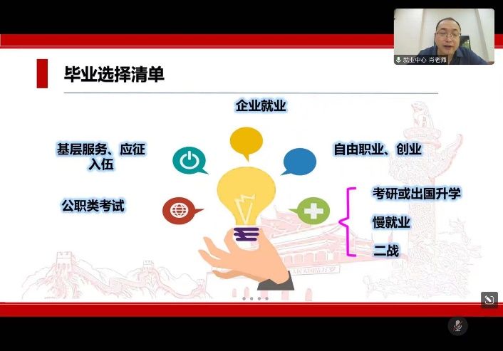 会议首先由中南财经政法大学就业指导服务中心就业育人办公室主任肖力玮就目前校内外就业信息进行分享,肖主任从就业形式、毕业去向和就业建议三个方面进行讲解,从基本准备、职业定位、先择再就、改进方法四个方面为同学们提供了就业建议,着重强调同学们应珍惜应届生身份,实现高质量就业。