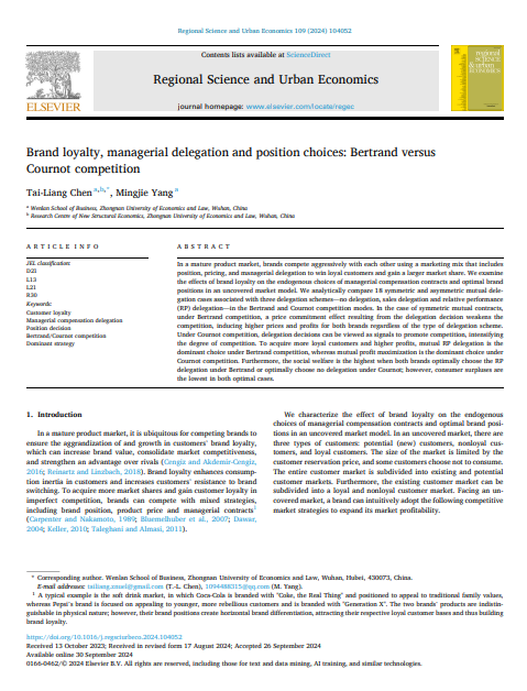 文澜学院2023级博士研究生杨茗杰与陈泰良教授共同完成的研究论文《Brand Loyalty, Managerial Delegation and Position Choices: Bertrand versus Cournot Competition》在国际权威区域经济学期刊《Regional Science and Urban Economics》上发表 (中南财经政法大学A-级期刊)。文澜学院坚持科研育人和实践育人的理念,旨在培养国际化、具有创新性、融通性的拔尖人才。学院从海内外聘请了大批优秀经济学博士及专家学者组建了文澜学院专职教师团队,积极为研究生搭建学术交流与科研实践平台,营造浓厚学术氛围。近年来文澜学院博士研究生取得的学术科研佳绩,进一步彰显了文澜学院科研人才培养模式的成效。