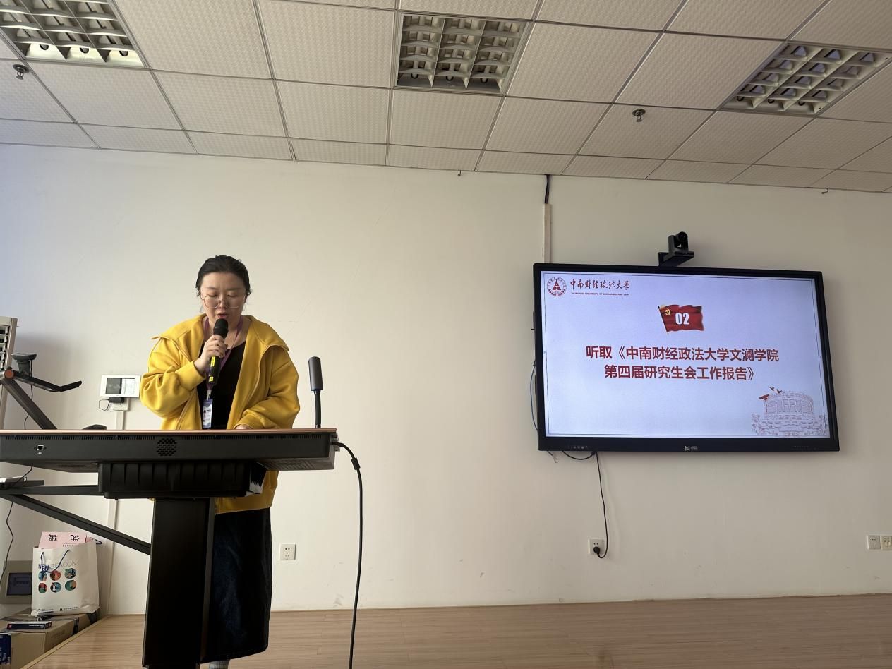 文澜学院第四届研究生会执行主席谭祎玮首先向大会作年度工作报告。该报告系统回顾了过去一年研会在多个领域的工作成效,报告在总结成绩的同时,也对研究生会未来的发展方向提出了建设性意见。