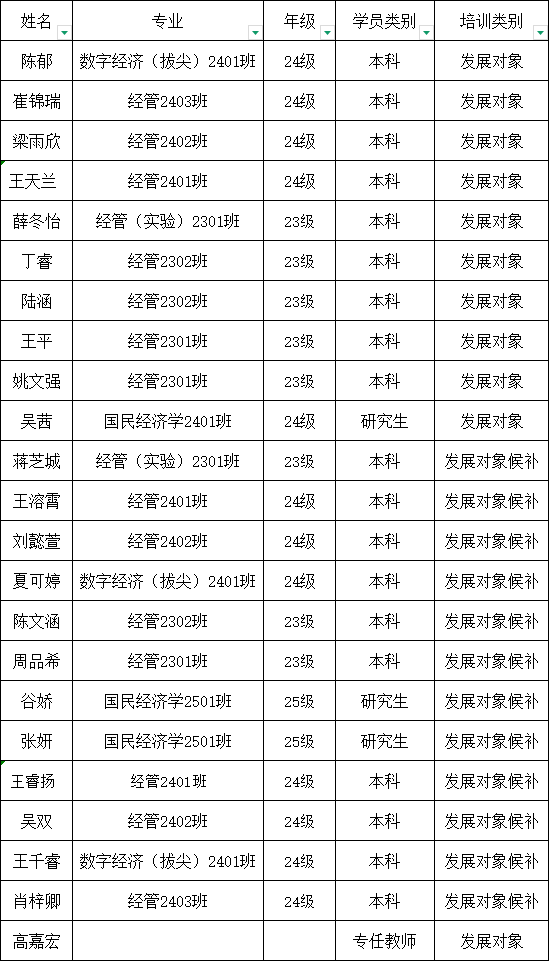 为了增强发展党员工作的透明度,接受党内外群众的监督,更好地保证发展党员的质量,根据《中国共产党章程》、《中国共产党发展党员工作细则(试行)》和我校《关于在发展党员工作中实行公示制度的意见》的有关规定,各党支部于2025年11月9日召开了支委会讨论新发展党员事宜。拟确定陈郁等师生为发展对象(含候补)。具体学生名单如下: